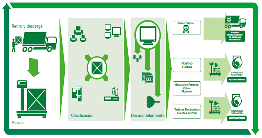 El proceso de reciclaje comienza en el momento en el que el aparato eléctrico y/o electrónico es desechado, recogido y transportado para su almacenaje y posterior tratamiento, y finaliza una vez obtenidas las materias primas a partir de las cuales se fabricarán nuevos AEE, u otros productos para su puesta en el mercado, es decir, su nueva introducción en el ciclo de vida.
